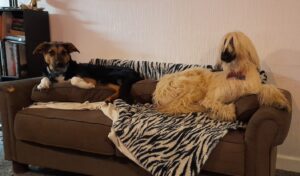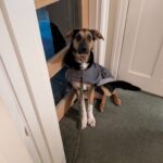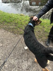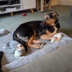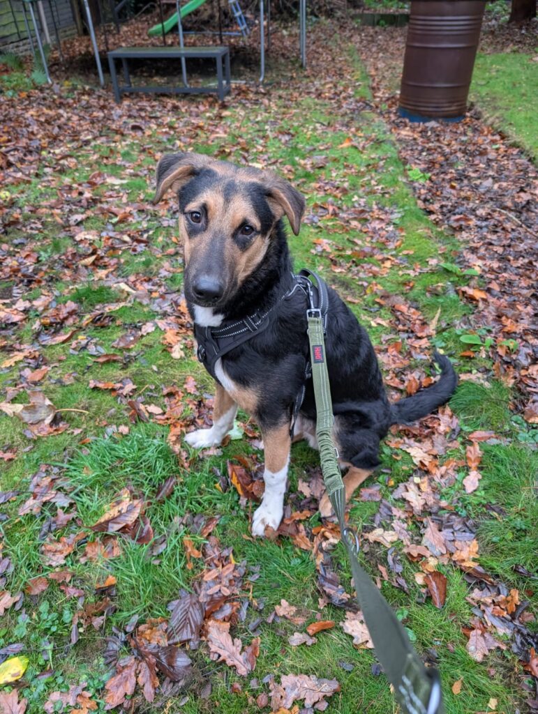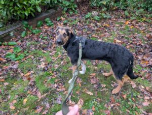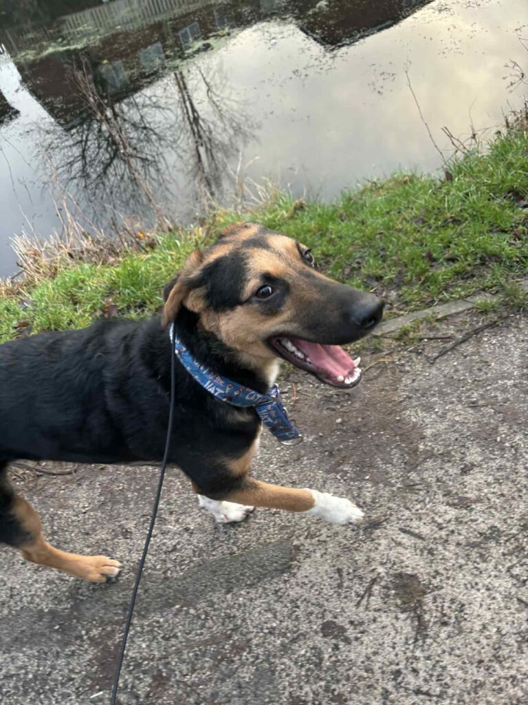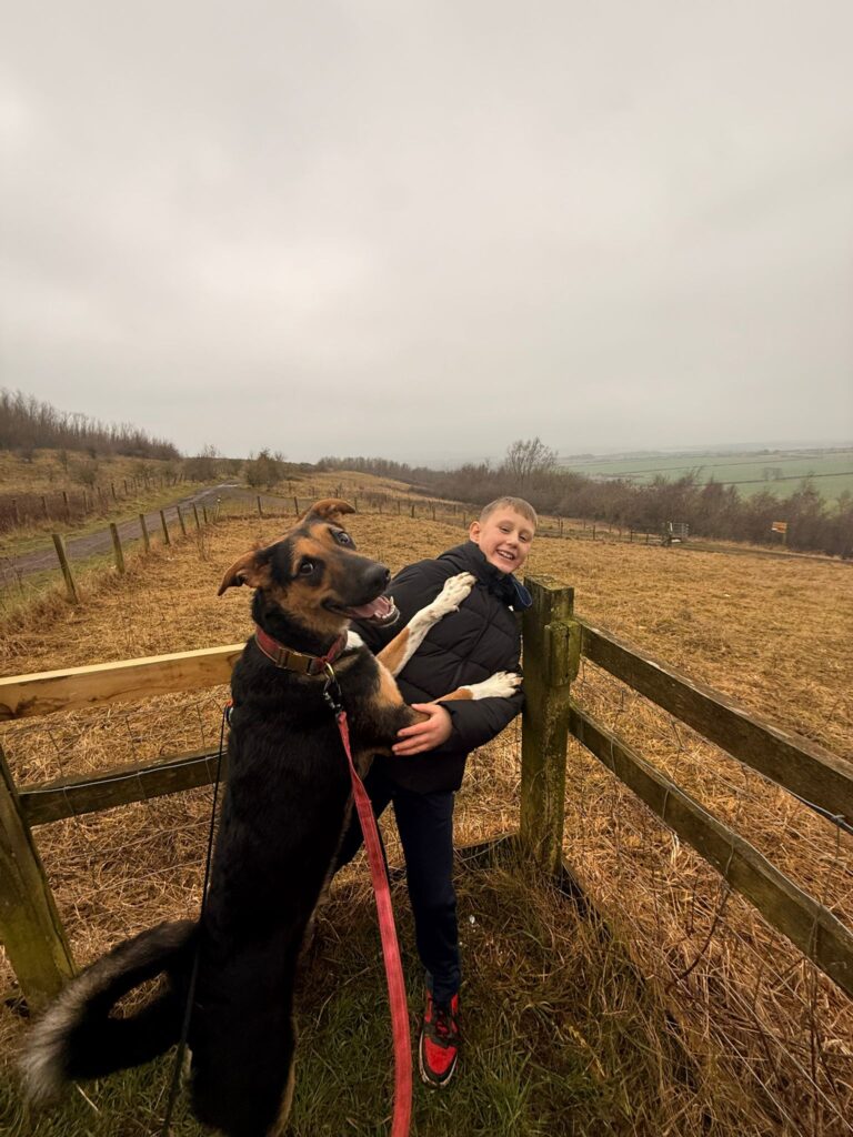 “We haven’t seen is any reactivity or shyness with people. On walks he passes people with no problem, happily stops to say hello and allows fuss. If someone has a dog, he gets silly on the lead — leaping and whimpering because he wants to play.”