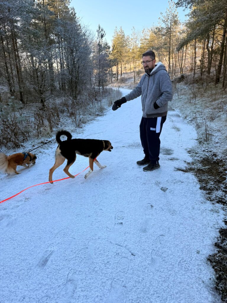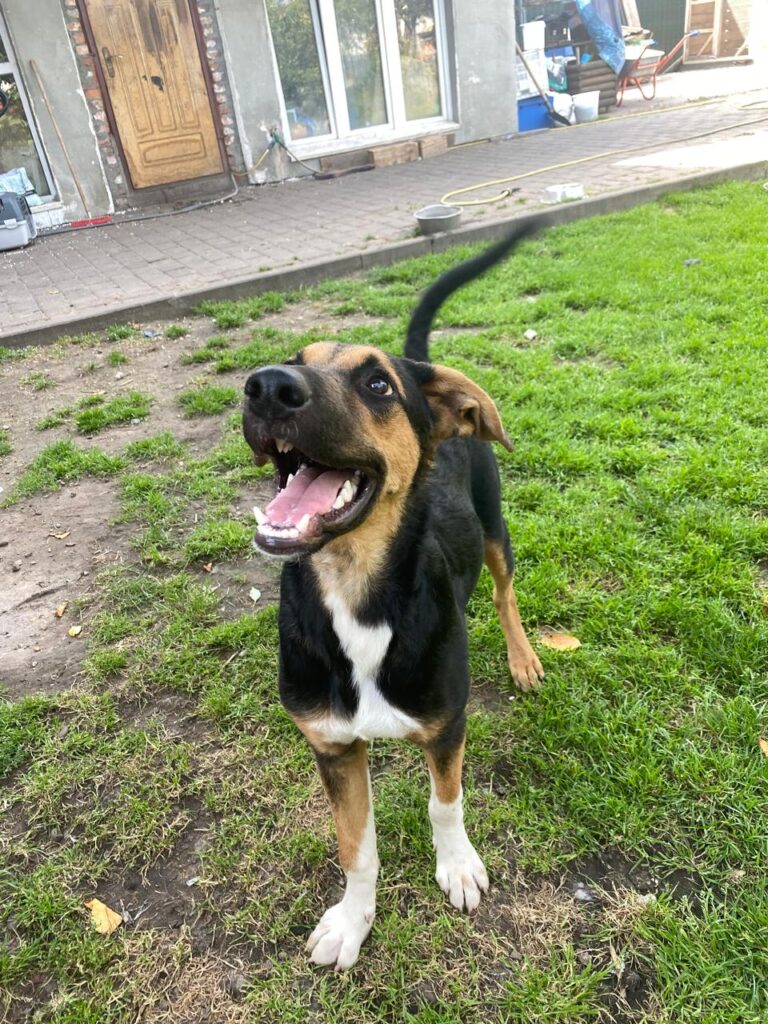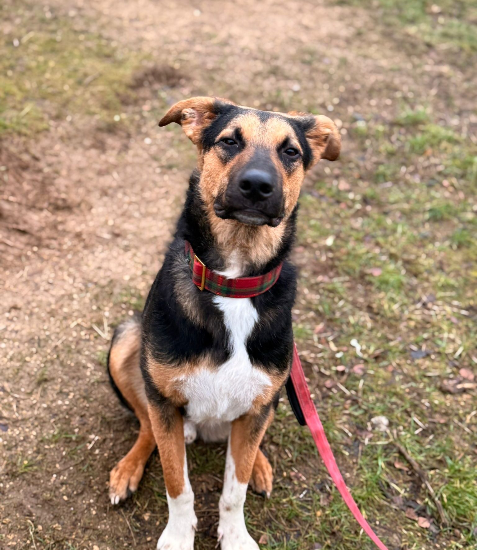 Bruno was born during the war, on a frontline, to a dog rescued by soldiers from a ruined village. He and his siblings were evacuated to the western part of Ukraine and raised safely in foster care, surrounded by kindness, space and other dogs. He grew up loved and secure — but with limited exposure to busy urban environments.