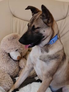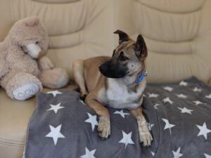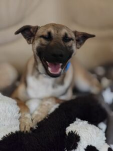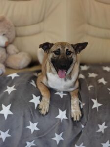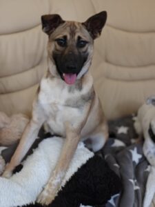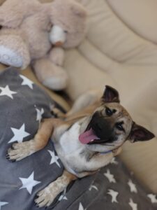 Lisa is pure sunshine — always happy, always open, always ready to love. She fits into any environment effortlessly and treats every new person like a friend. She absolutely adores toys — so much that even while still a bit sleepy after her spay surgery, she dragged her toy into the recovery basket with her.