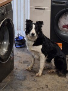 She sleeps downstairs, is used to a home with a garden, has no separation anxiety, settles when left, and is generally well-mannered inside the house. She does have minor food-guarding tendencies, nothing unusual for a young energetic collie, and something easily improved with calm guidance and routine.
