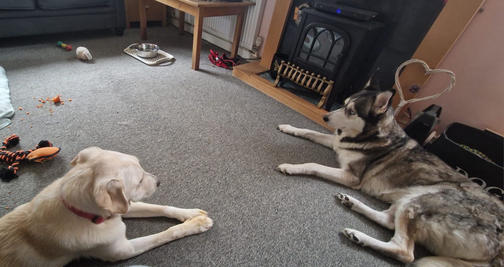 Morozko has formed lovely bonds with people and clearly enjoys company — he follows his favourite person around and loves to play and interact. He has met new people and shown himself to be friendly and open. Living with another dog has helped him greatly. He initially looked to the resident husky for reassurance and learned from her, and a confident canine companion would continue to support his development.