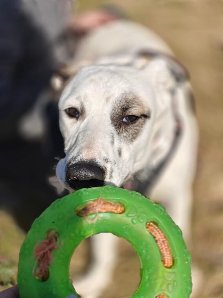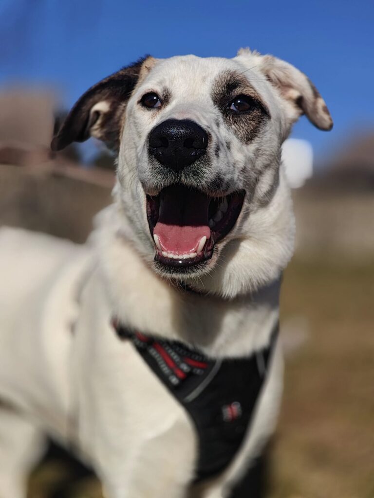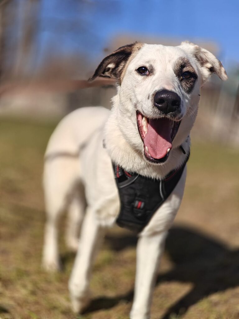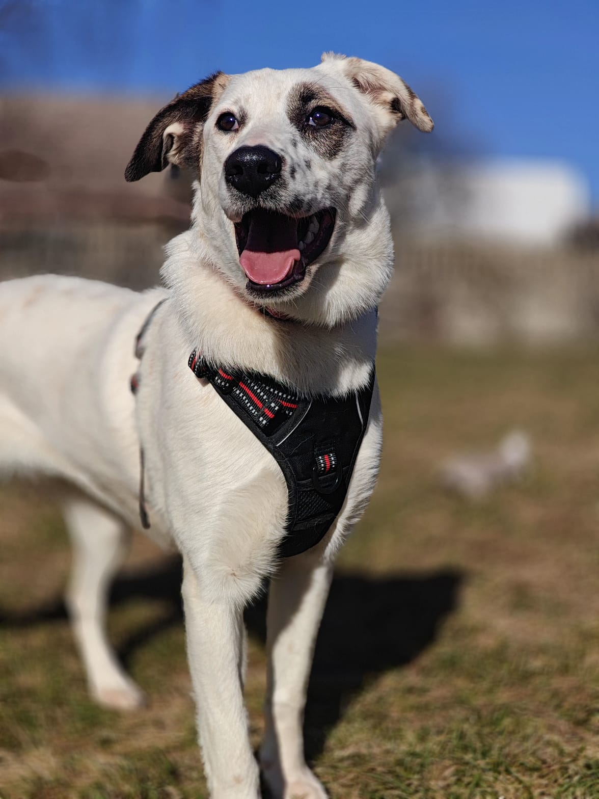 She is extremely playful and energetic, loves toys, and enjoys learning new things. With food motivation and her sharp mind, training will be a joy. She lives indoors, is learning lead skills, and adapts quickly to routines. With cats behind the fence, she shows friendly curiosity without intensity or aggression.