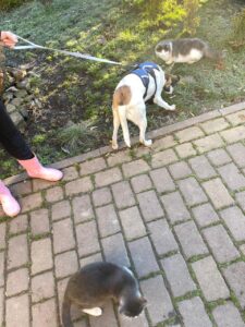 • DOGS: Very friendly with dogs of all sizes, enjoys group walks and play